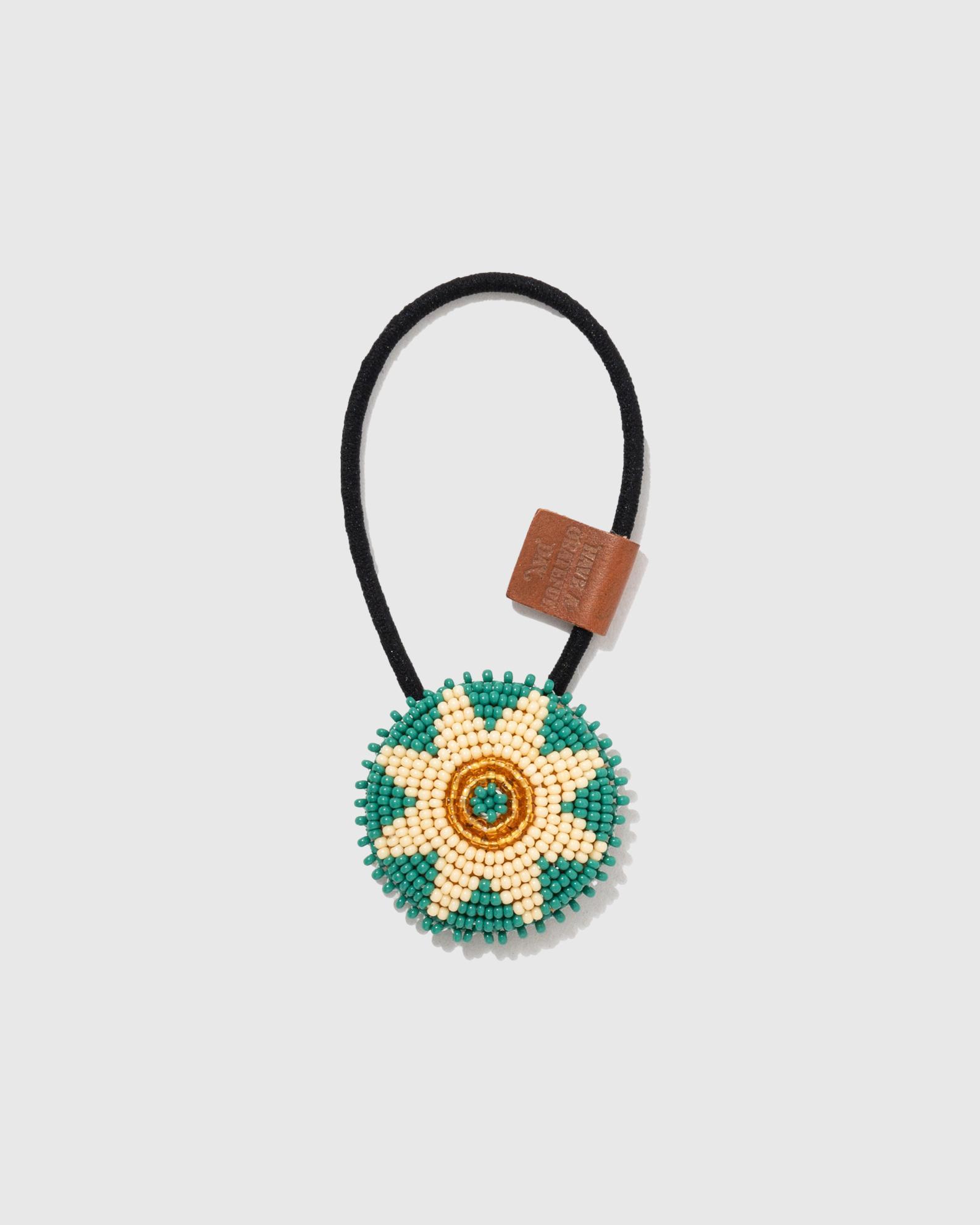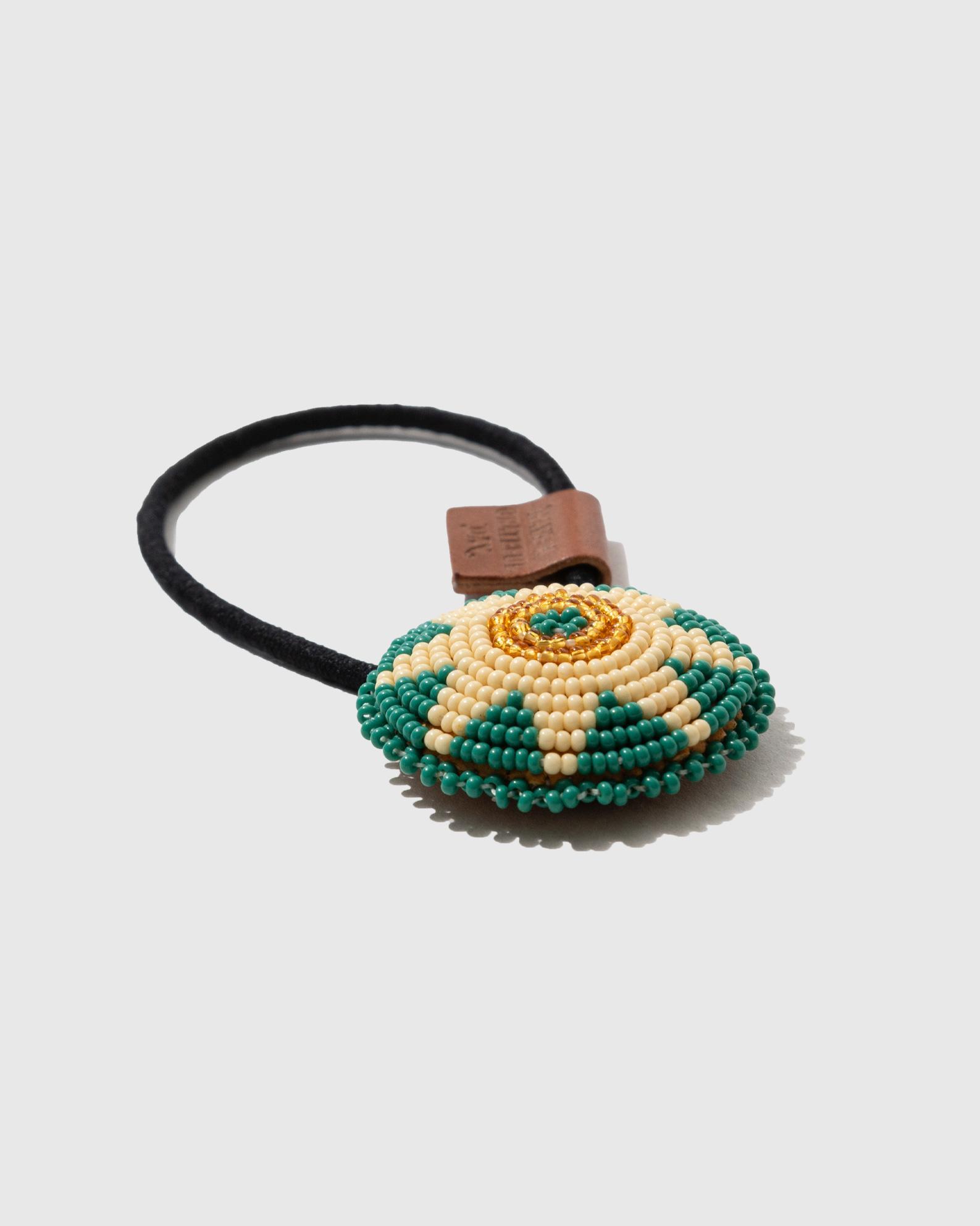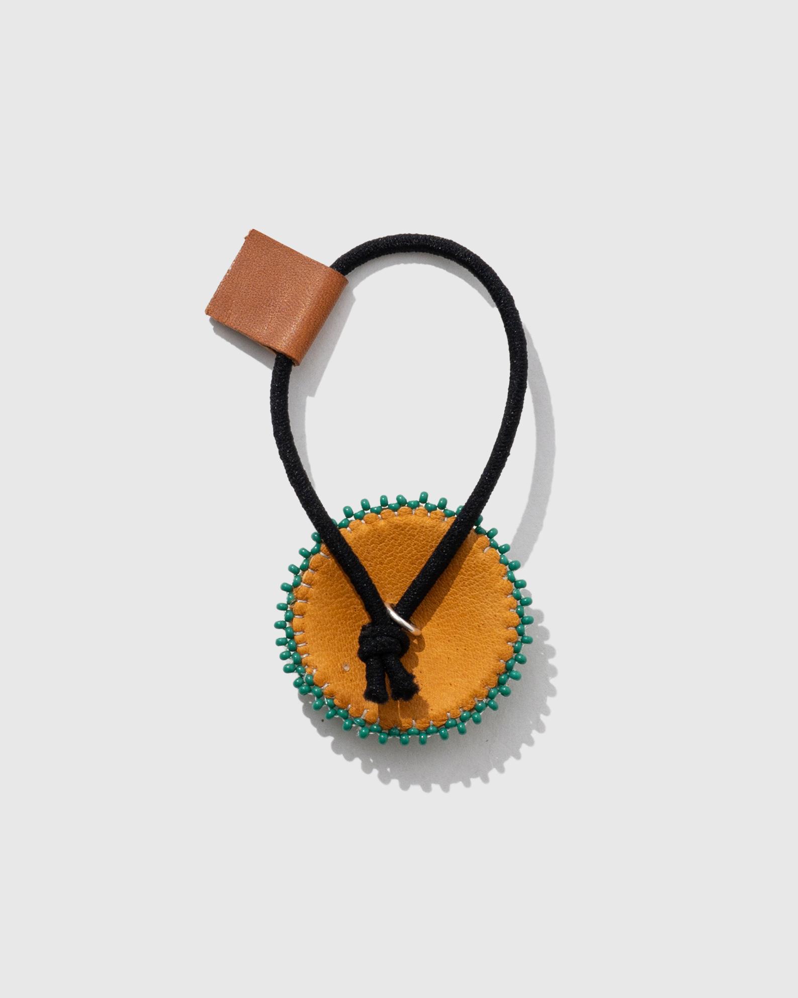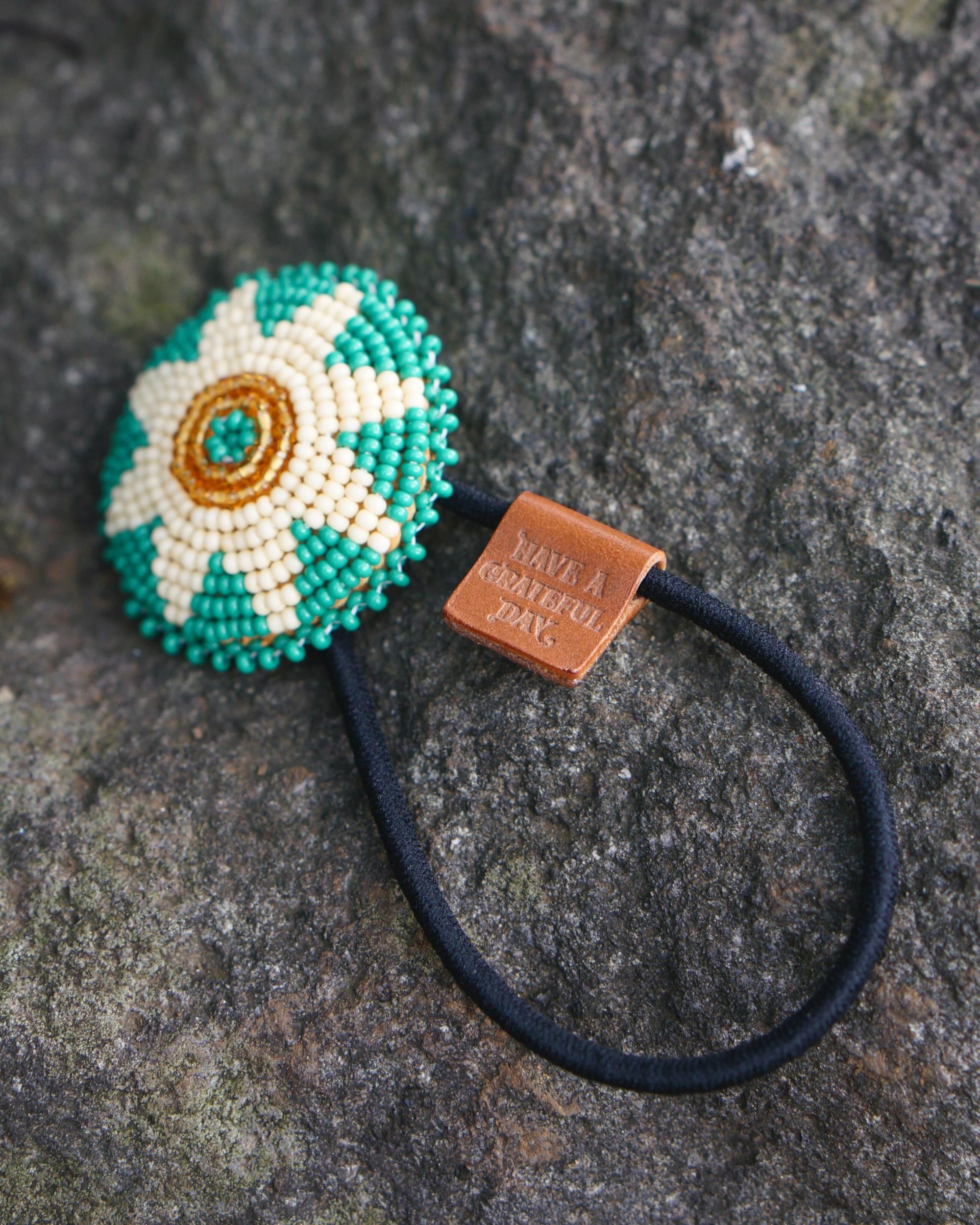 燻された鹿革にチェコシードビーズを細工したビーズコンチョ。髪留めとして使用するのはもちろん、ブレスレットやスカーフ留めとしてもおすすめです。