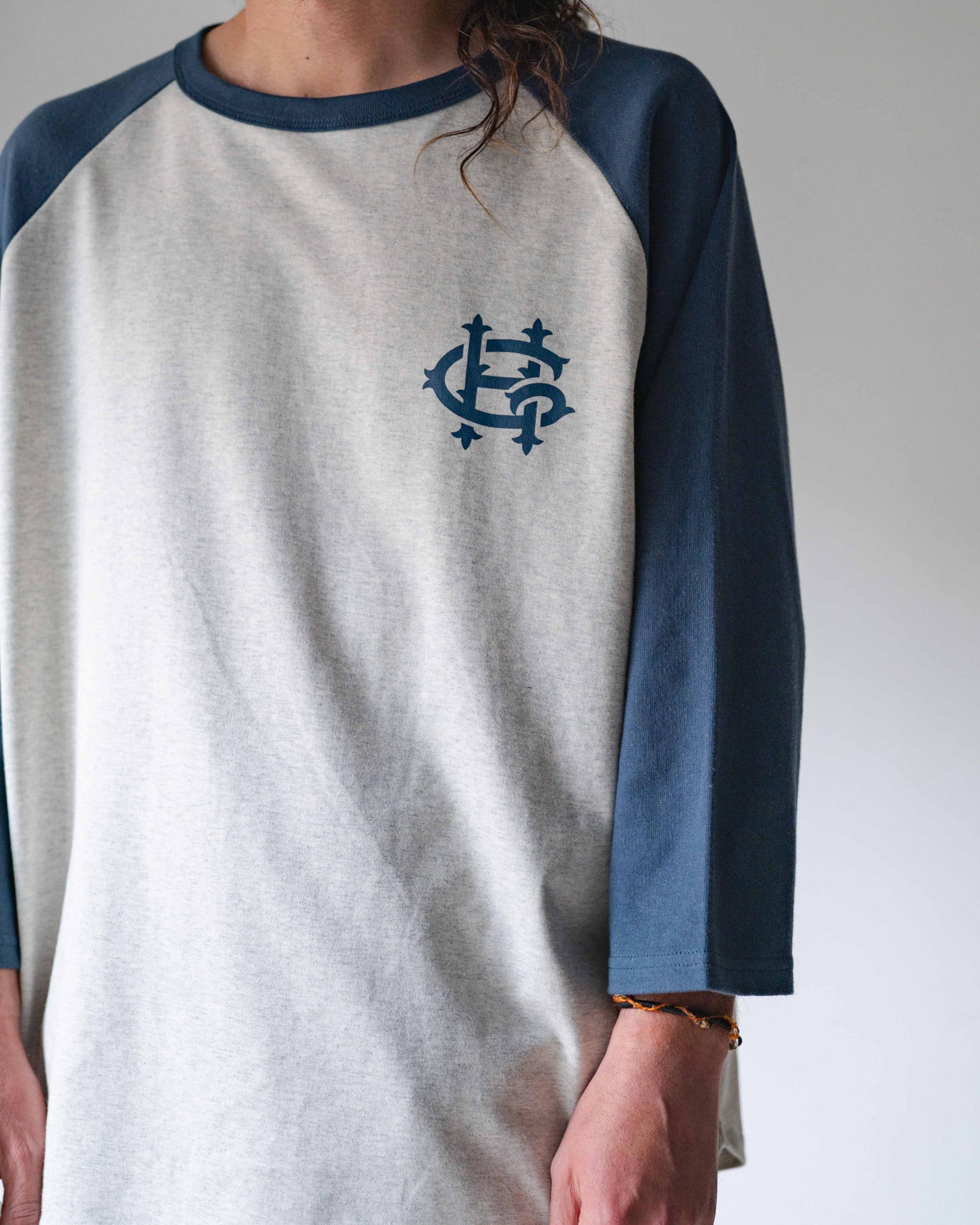 ヘザー(杢)を使用したベースボールTシャツ。