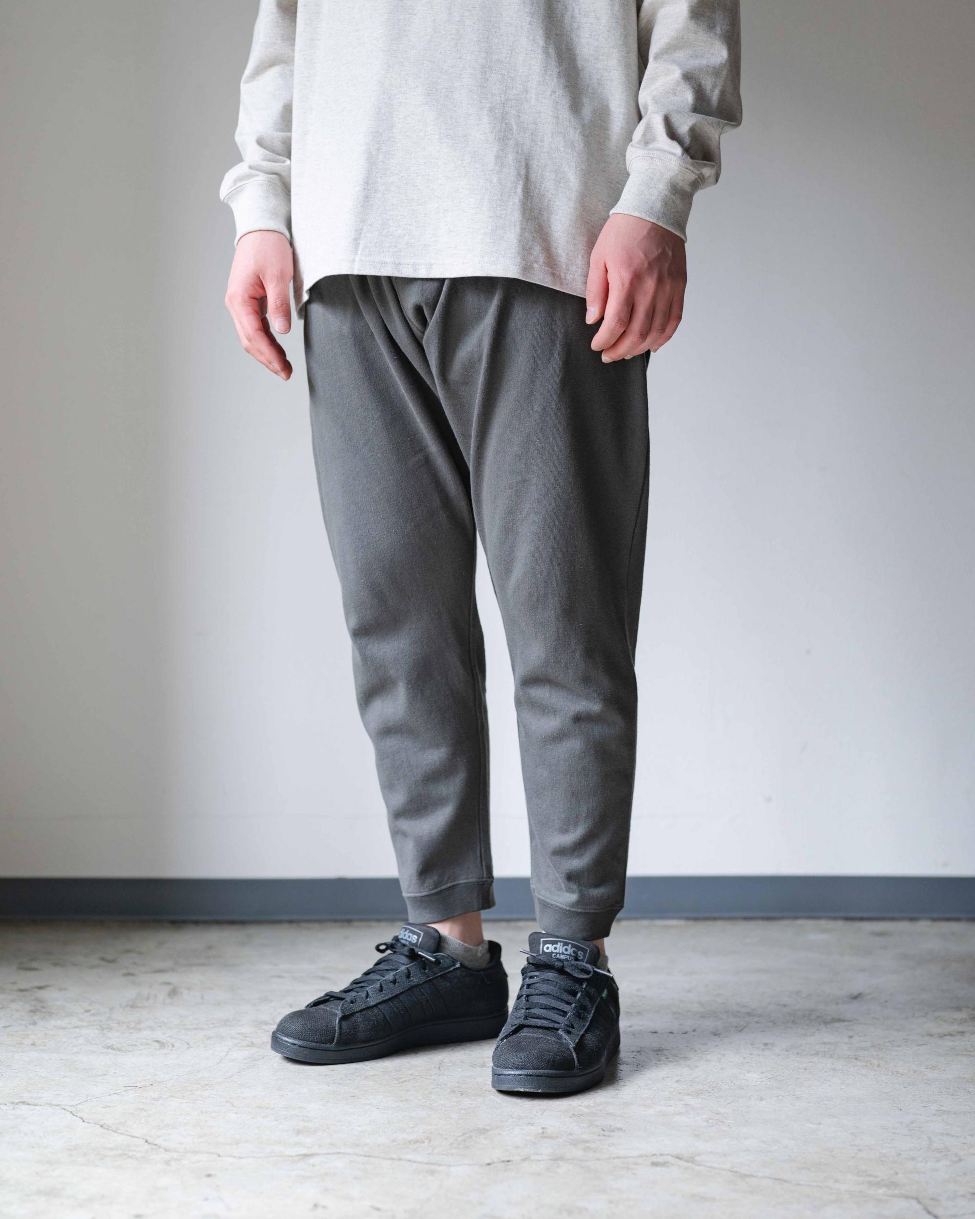 股上にゆとりをあたえたサルエルパンツです。ルーズな着用感ですが、膝から裾にかけて細身に仕上げ、やや短めの9分丈に設定することですっきりと上品な印象になるよう計算されています。