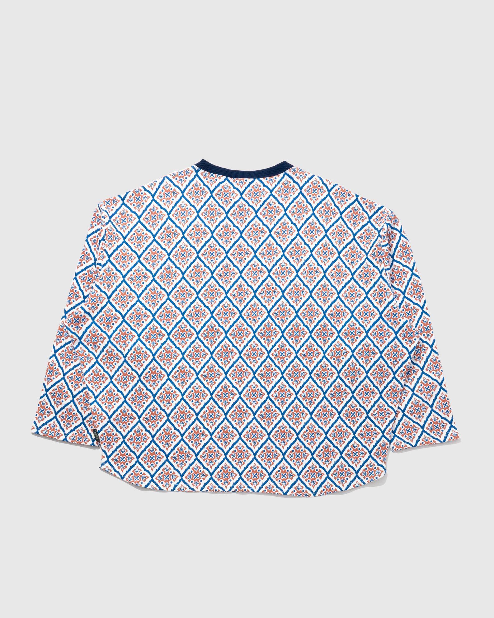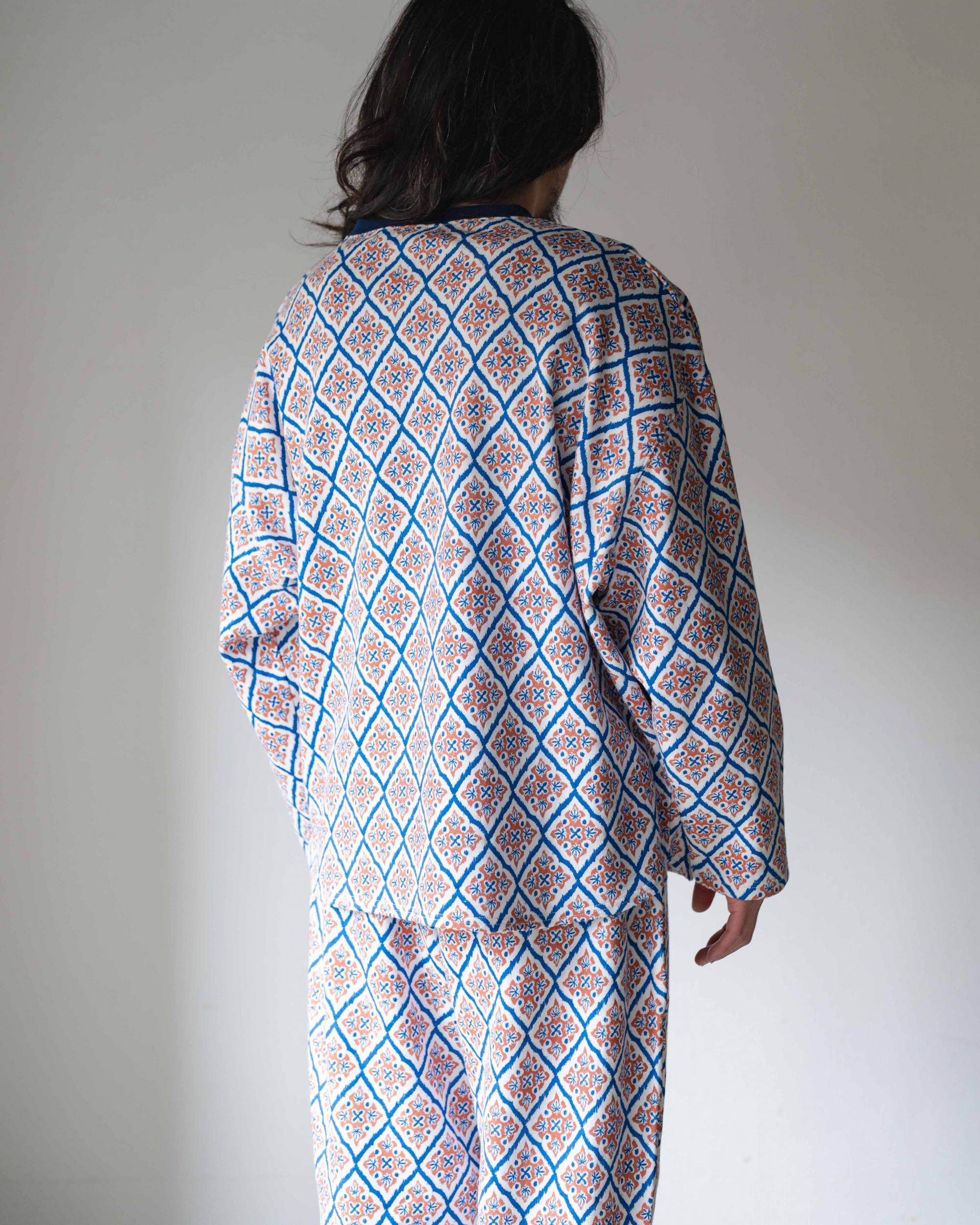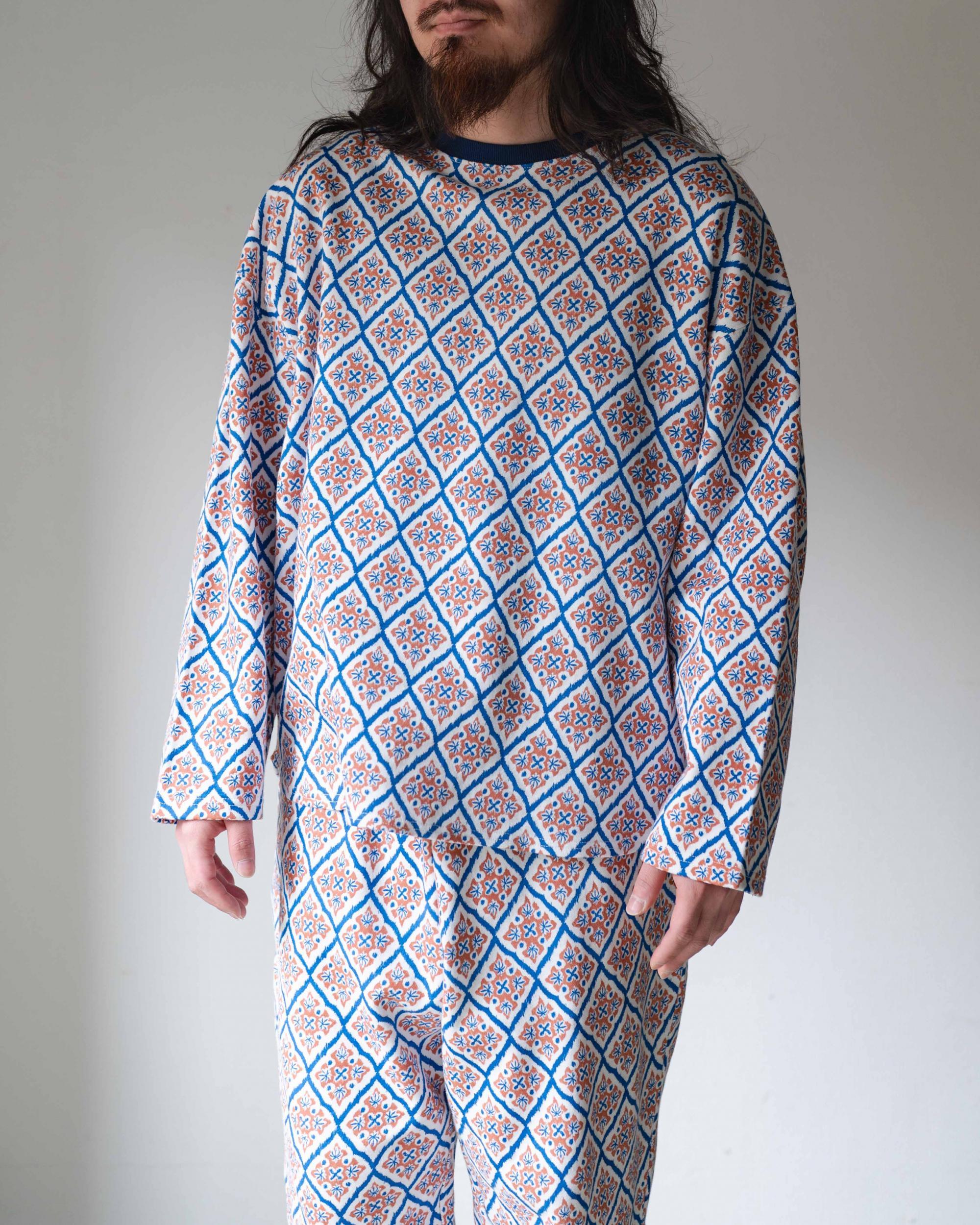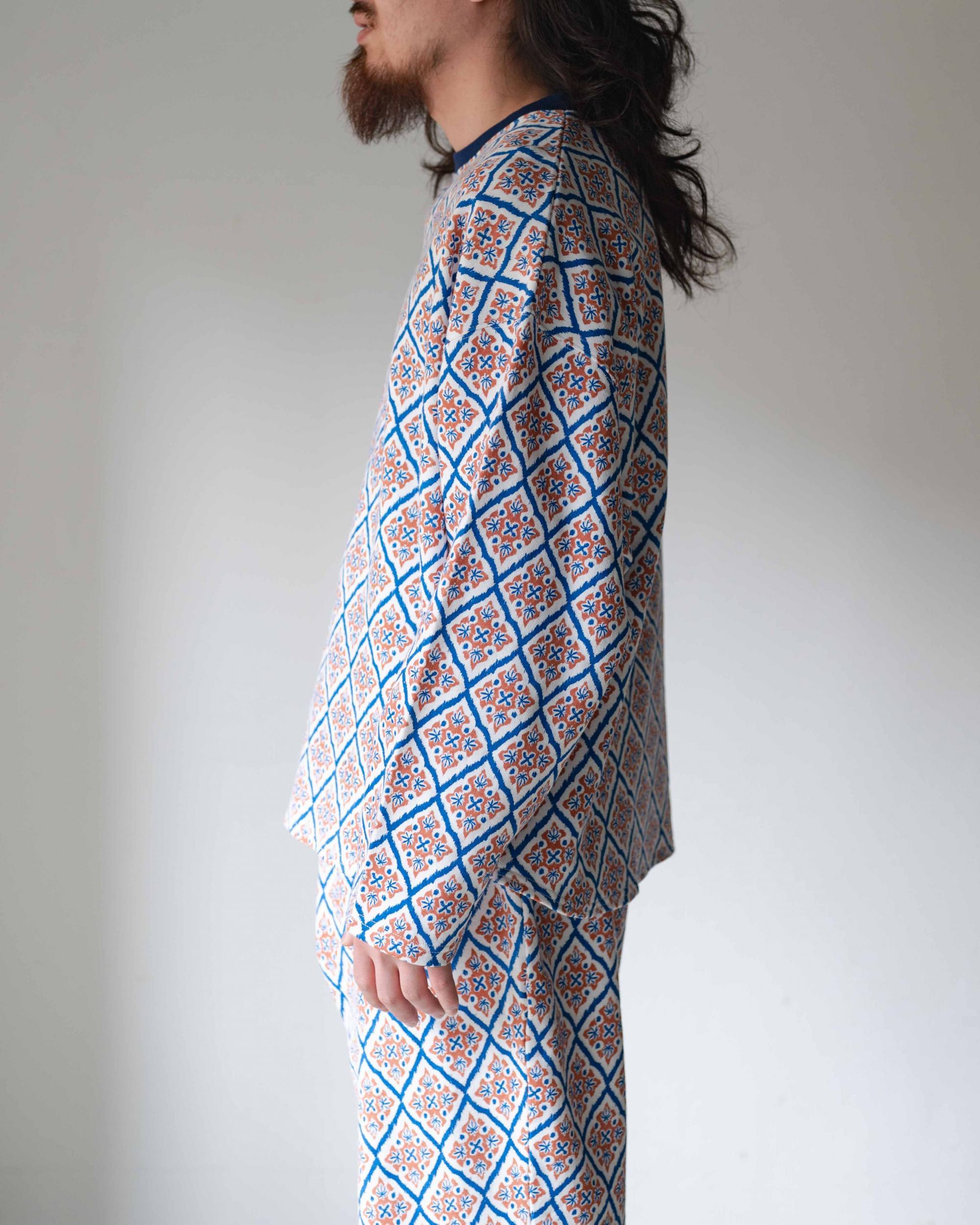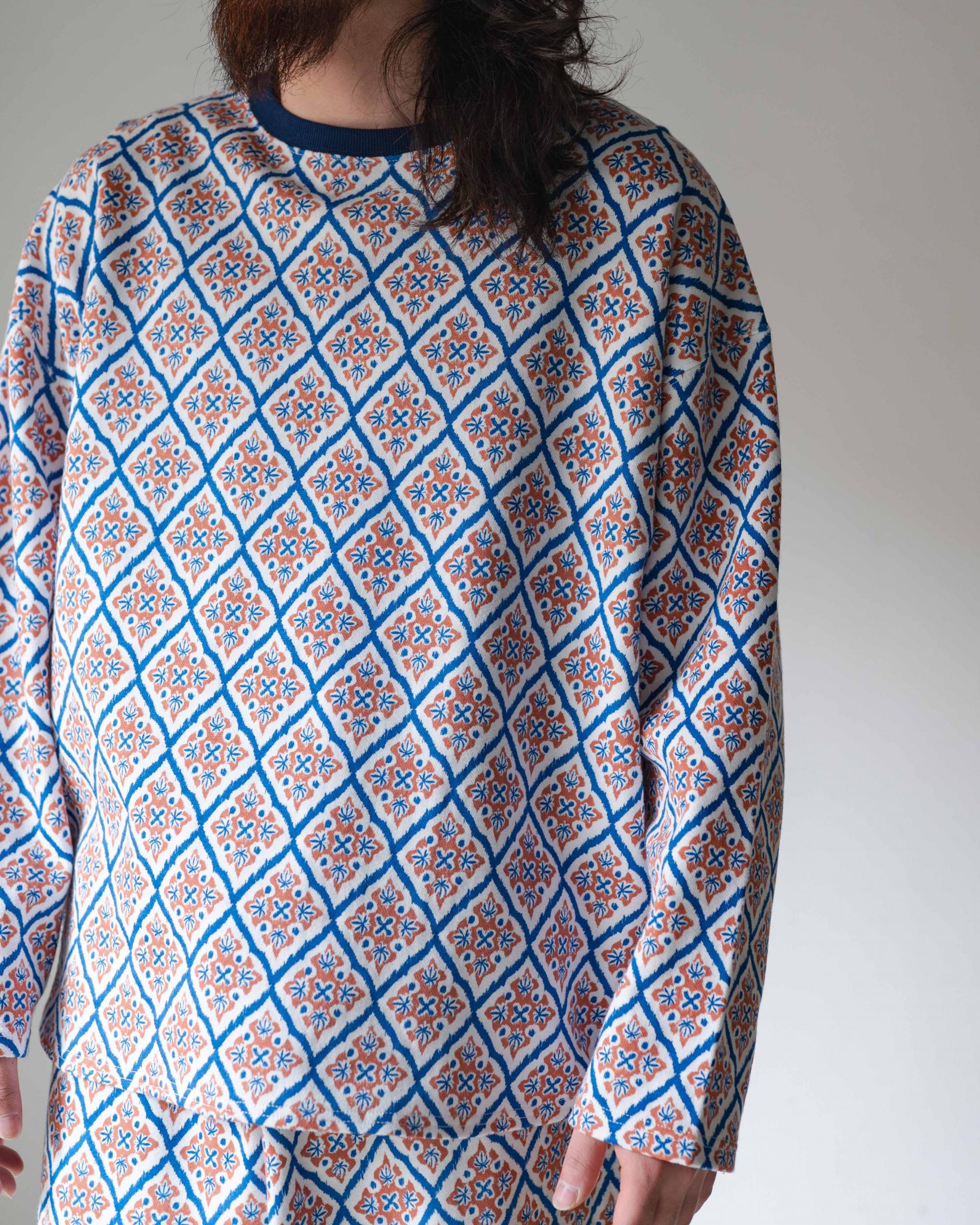 打ち込みが良く程よい肉感で耐久性がありながら、柔らかさと肌触りに優れたスムースジャージーの総柄シリーズ。10ozジャージーとスウェットの中間のイメージで、3シーズンあらゆるシーンで使い勝手が良い素材です。
