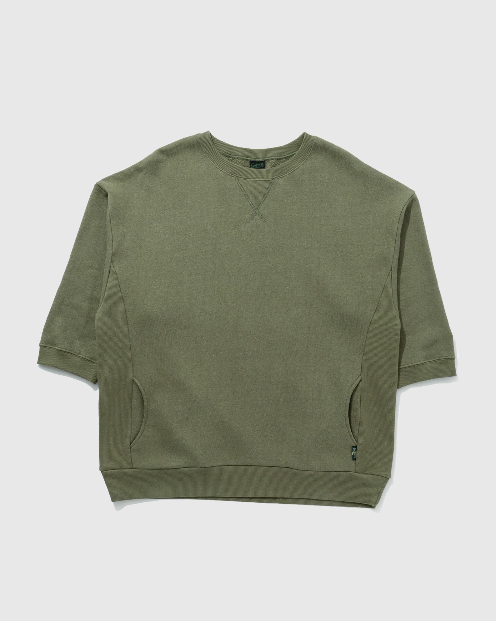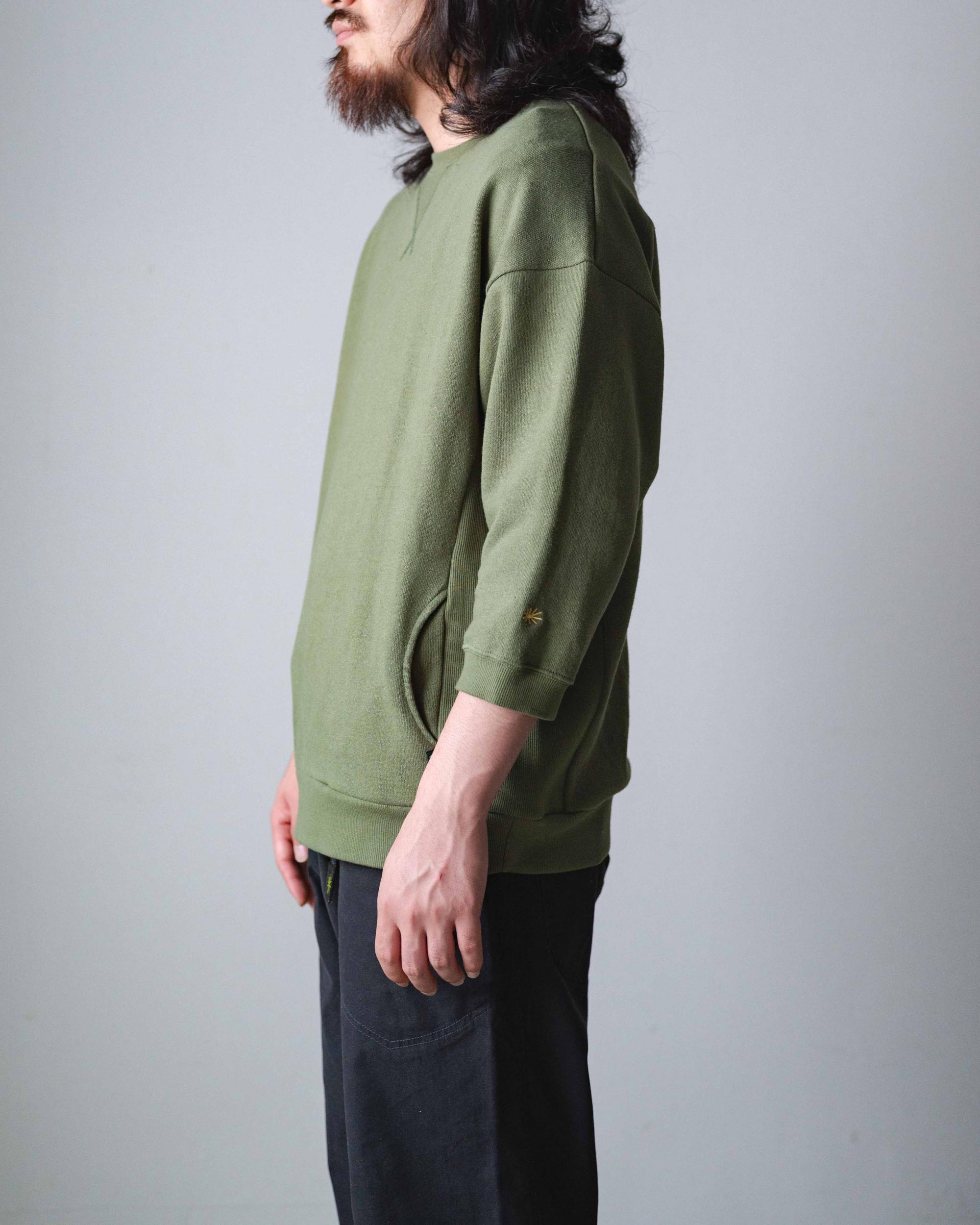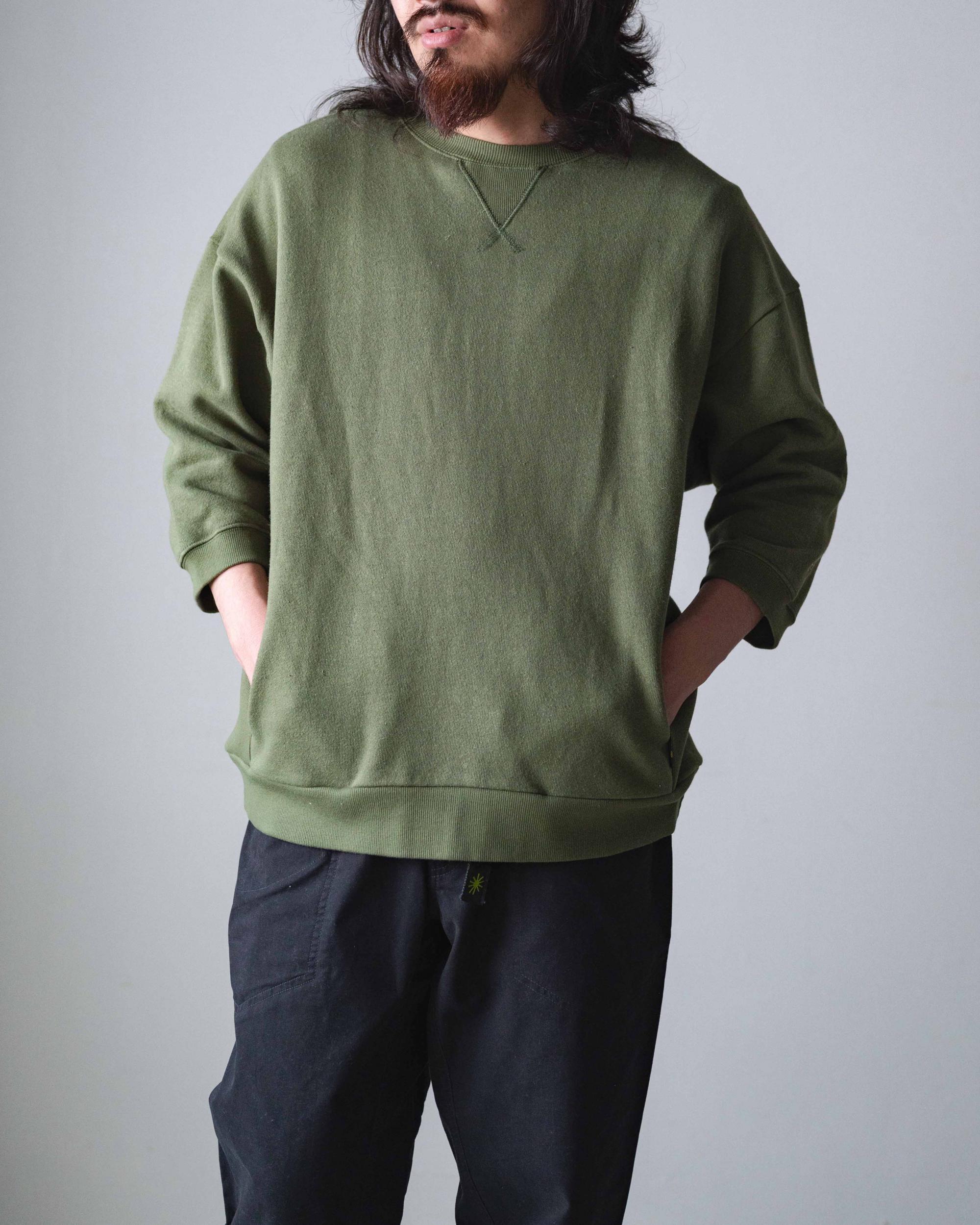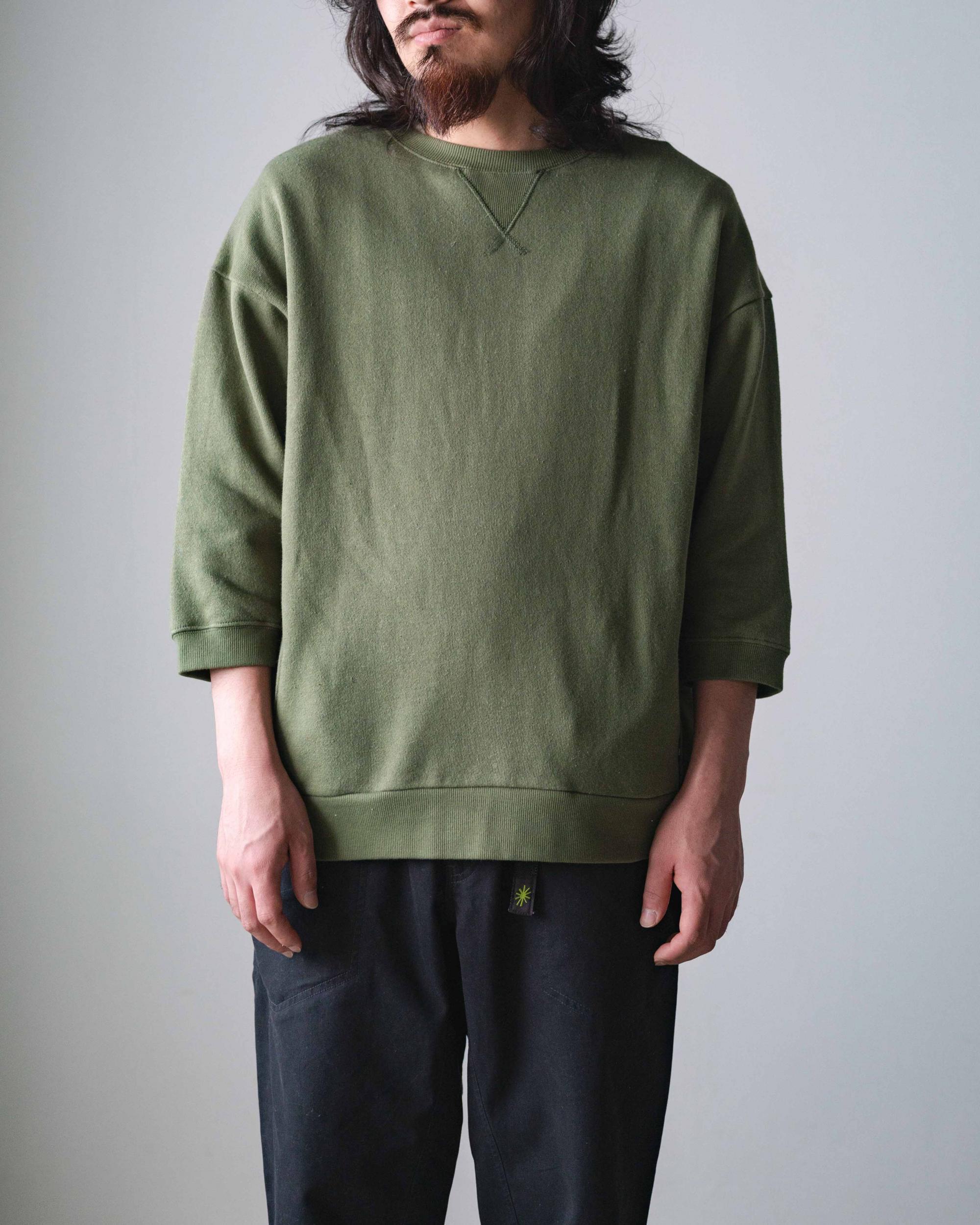 袖を半端丈に設定し、ガゼットやサイドパネルなど随所にアクセントを加えたクルーネックシャツです。身幅が広くやや着丈が長いルーズシルエットです。