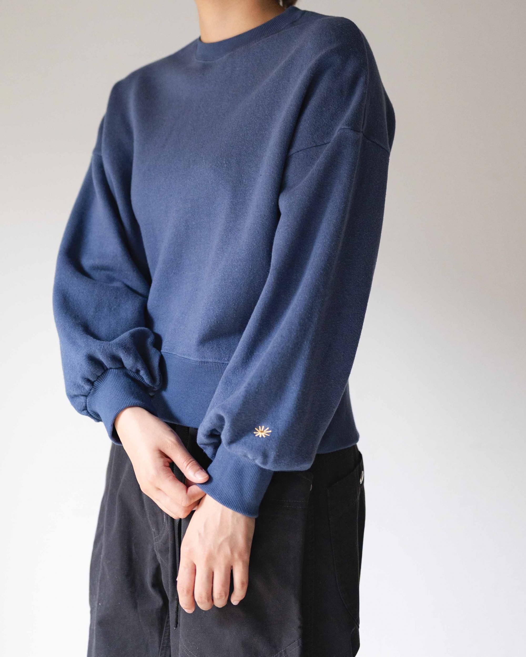 パフスリーブとドロップショルダーデザインのフェミニンな要素が詰まったレディーススウェットシャツです。プッシュアップして袖にボリュームを出して着て頂いてもおすすめです。