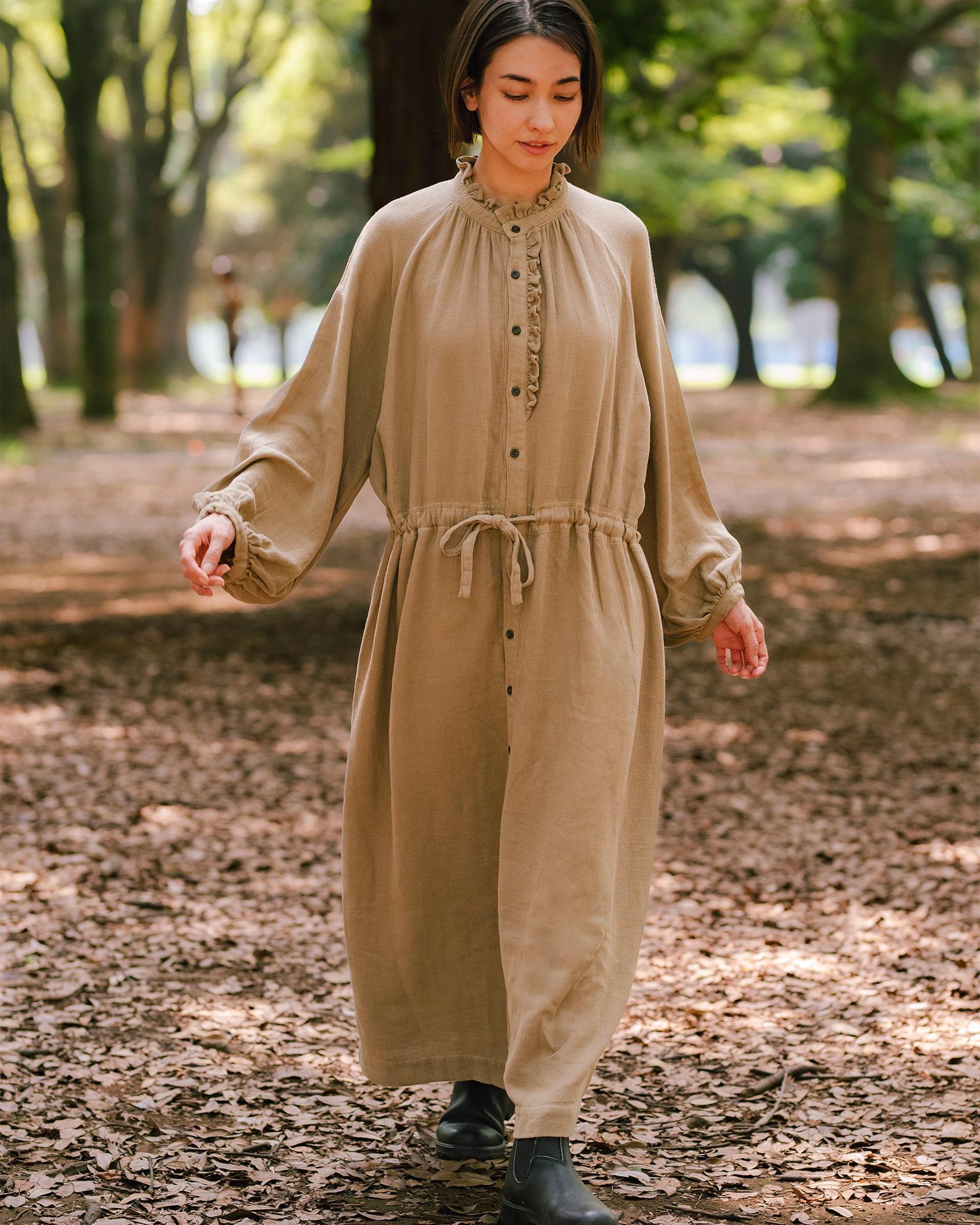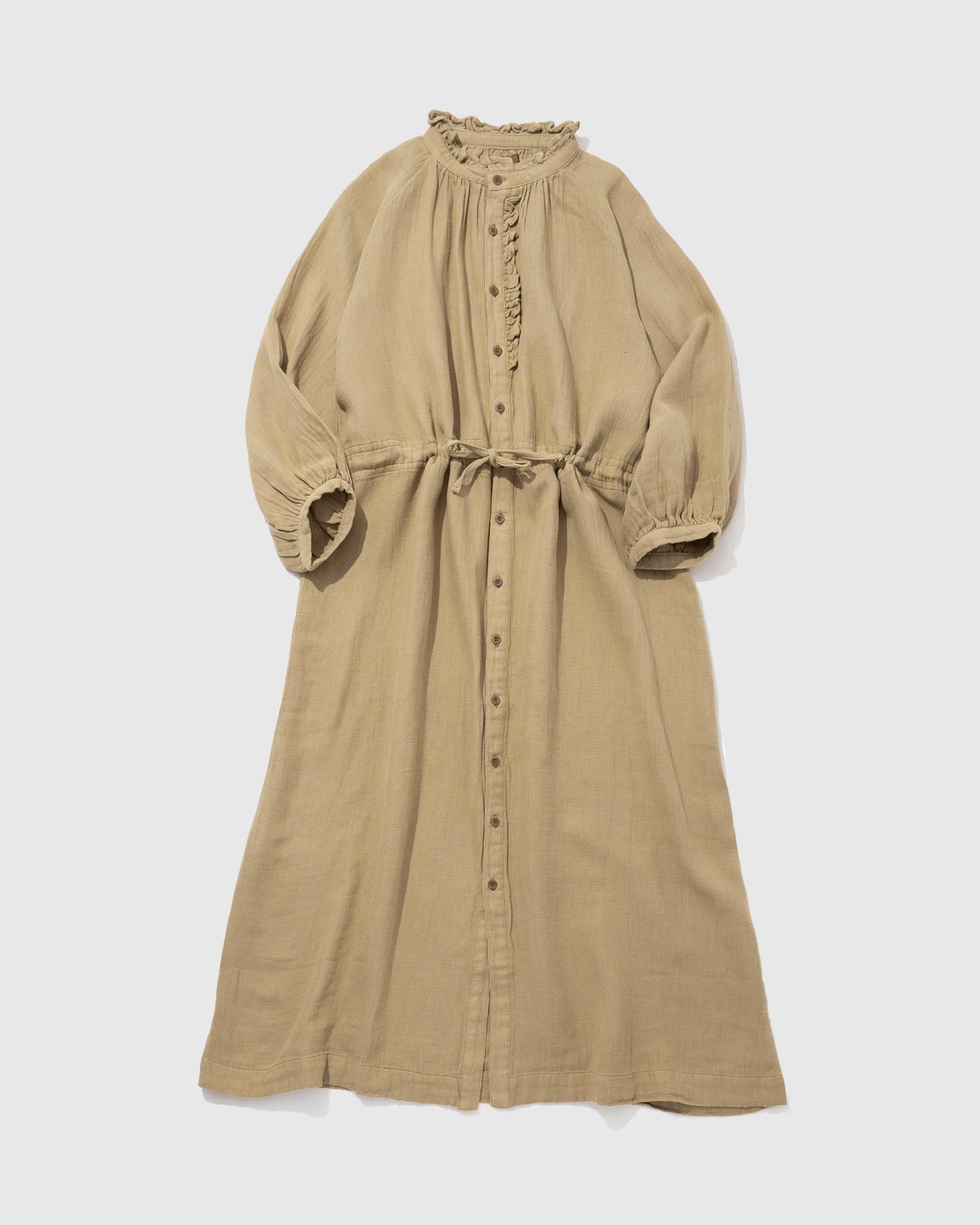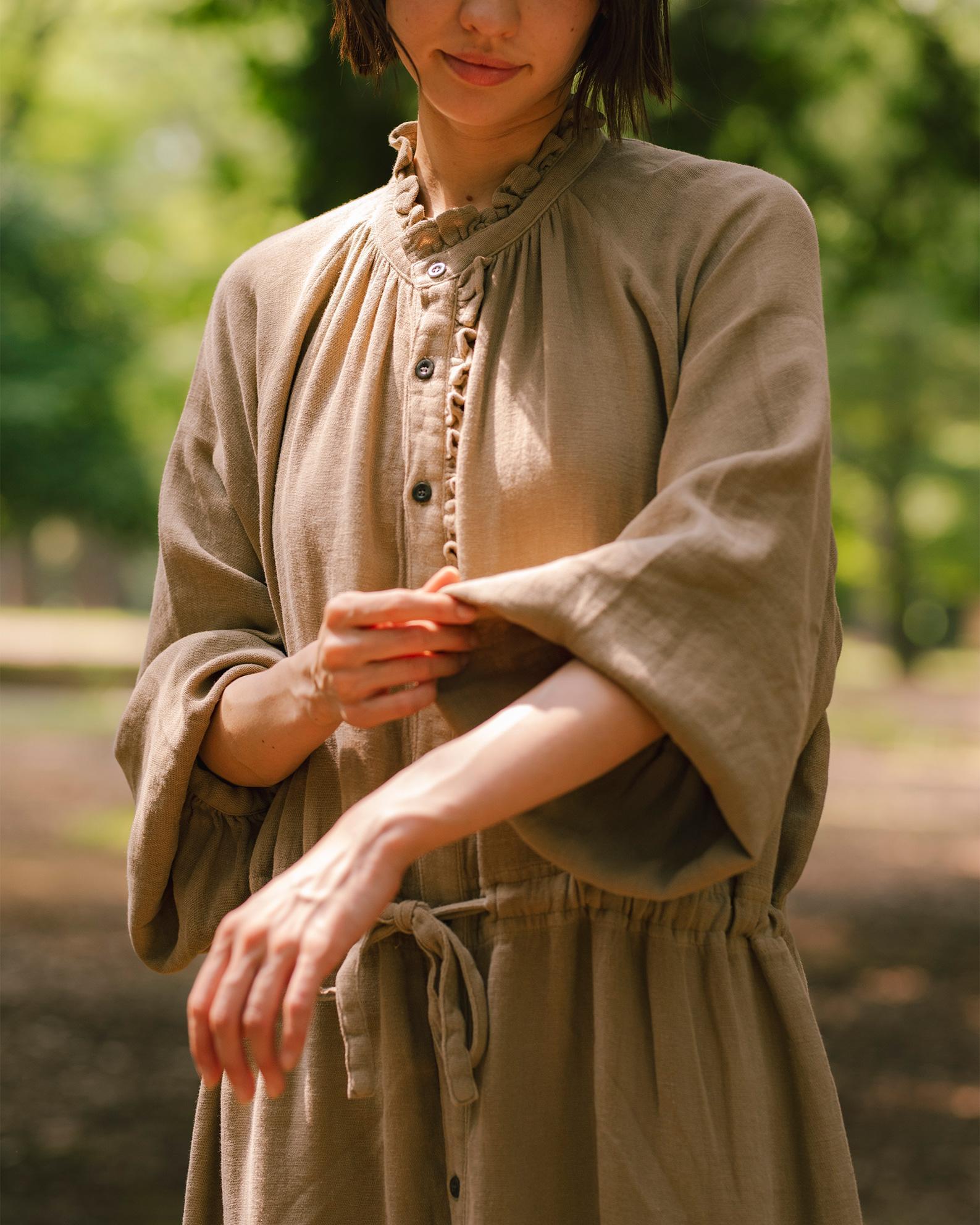 襟と前縦にミニフリルが施されてた女性らしいデザインのワンピースです。着やすさを考慮し適度にゆとりを与えたベーシックなシルエットです。