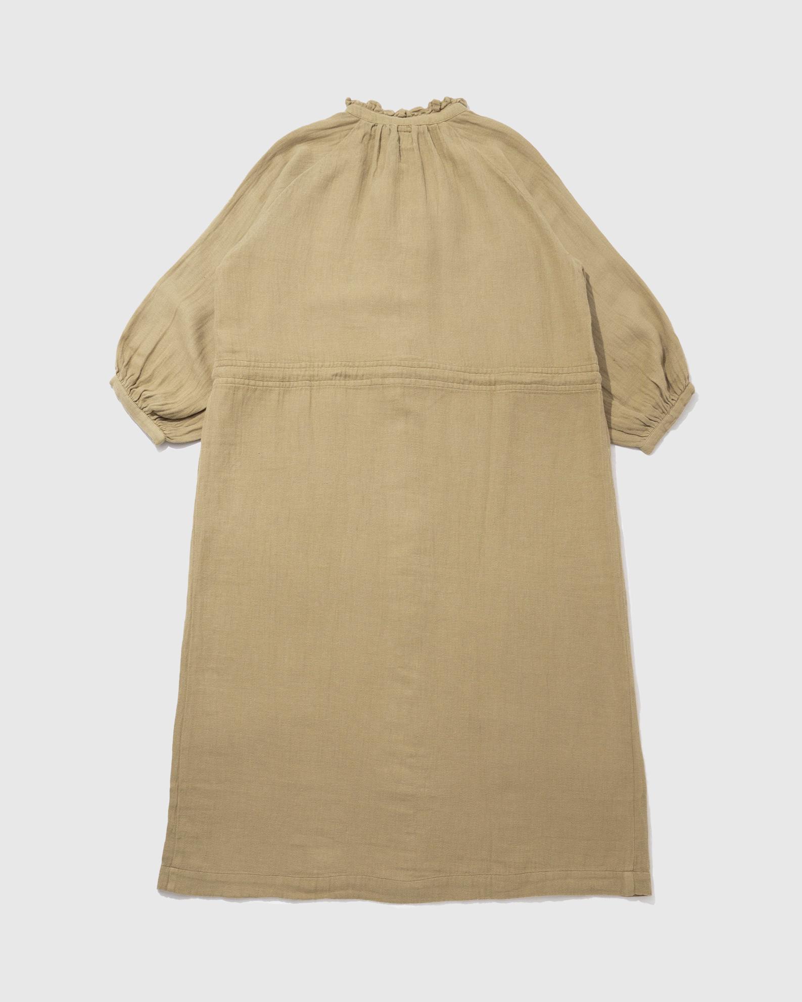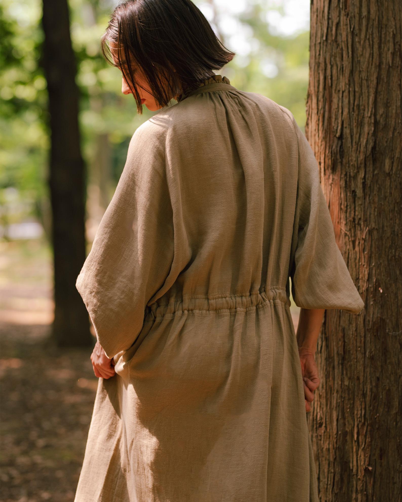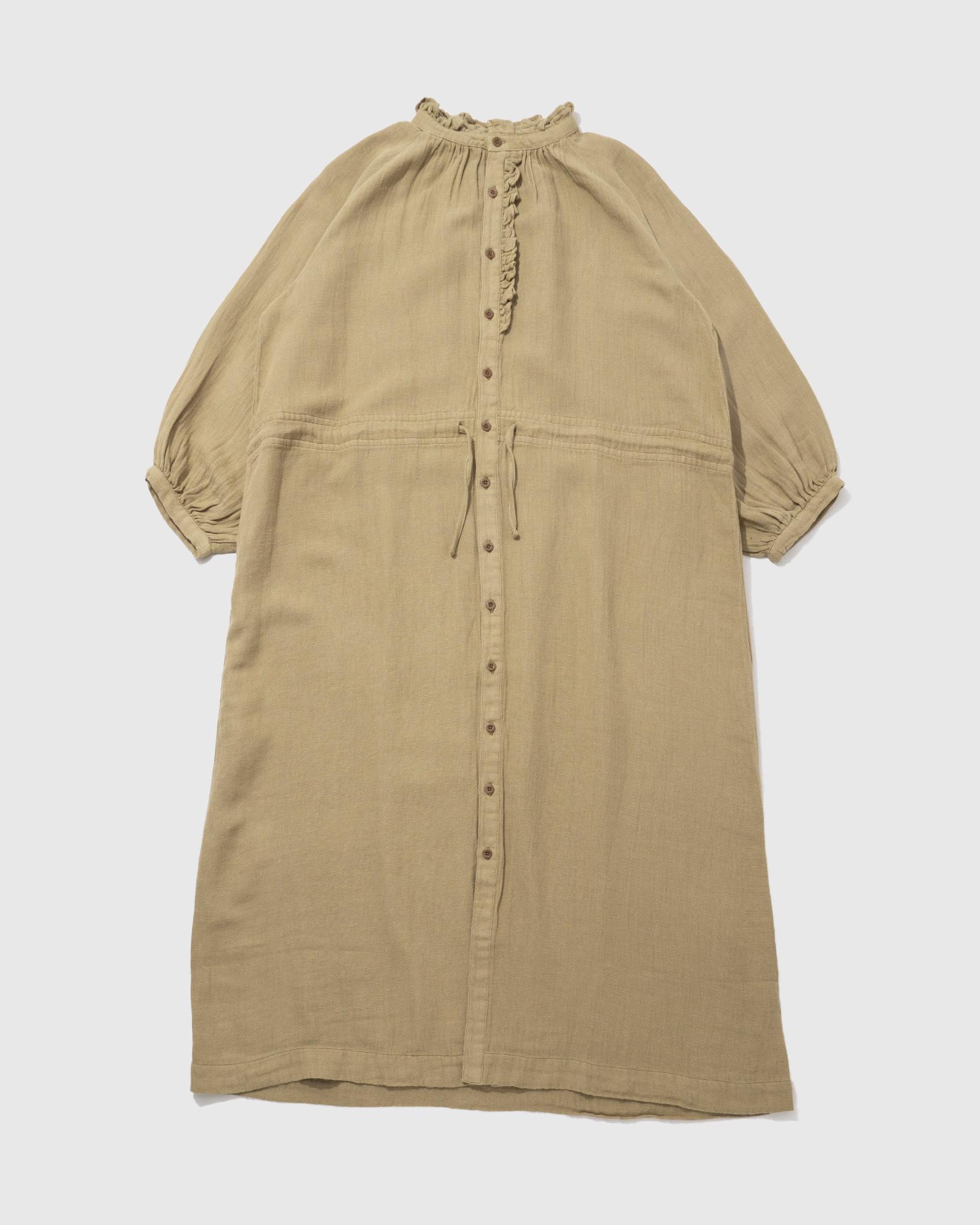 襟と前縦にミニフリルが施されてた女性らしいデザインのワンピースです。着やすさを考慮し適度にゆとりを与えたベーシックなシルエットです。