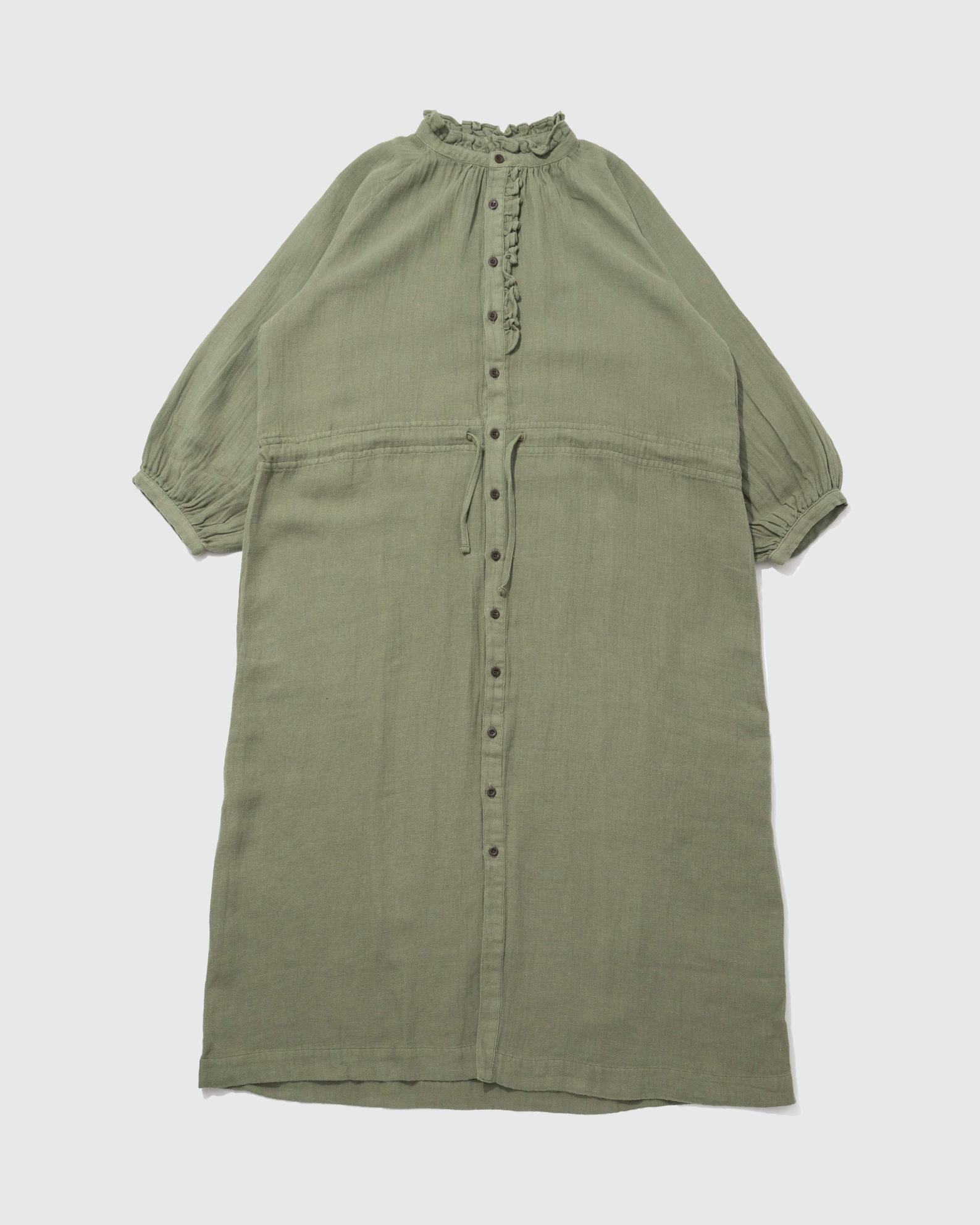 襟と前縦にミニフリルが施されてた女性らしいデザインのワンピースです。着やすさを考慮し適度にゆとりを与えたベーシックなシルエットです。