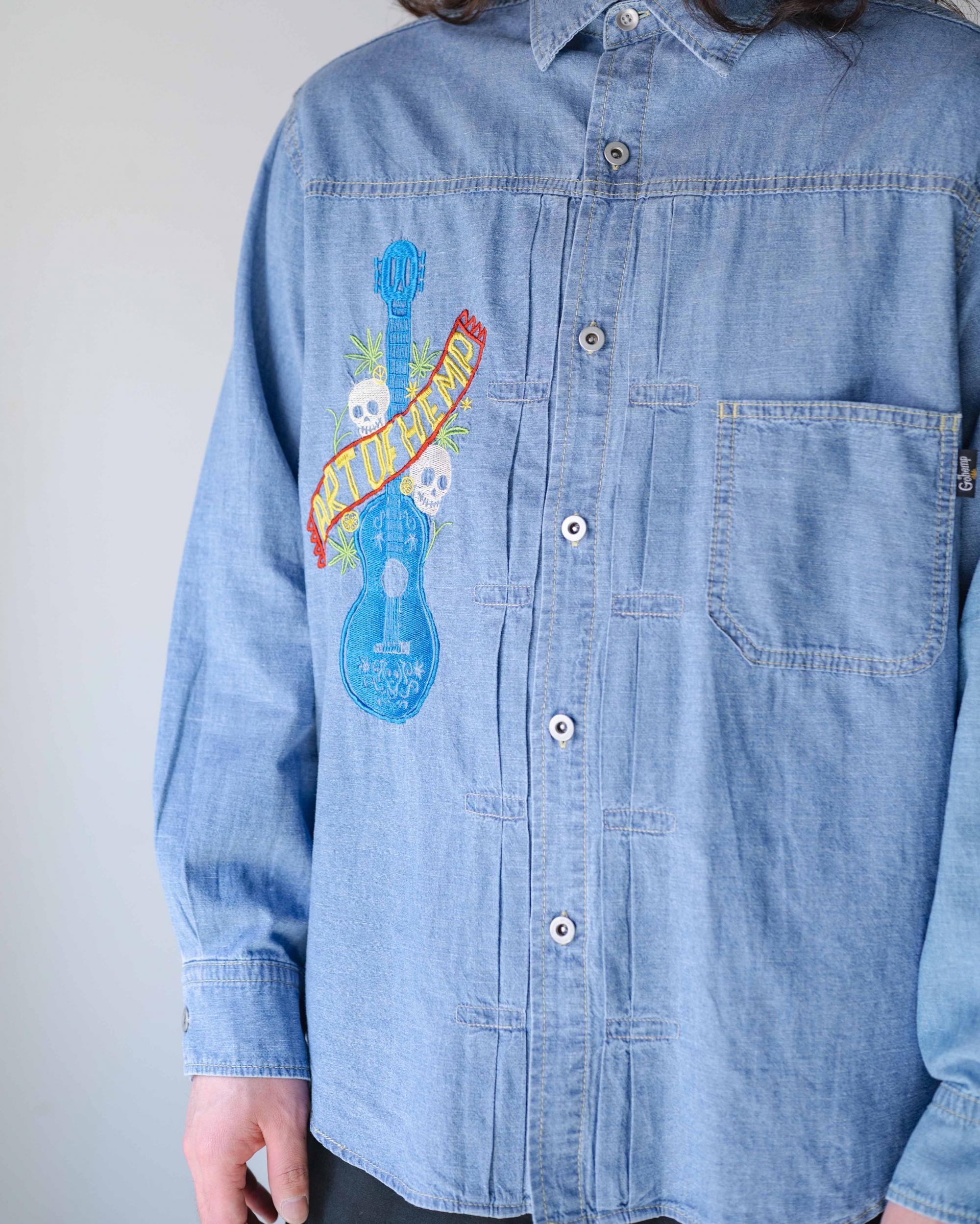 ライトながら丈夫で、また通気性や吸湿性が高く3シーズン着回しができるヘンプコットンシャンブレーの刺繍シリーズ。