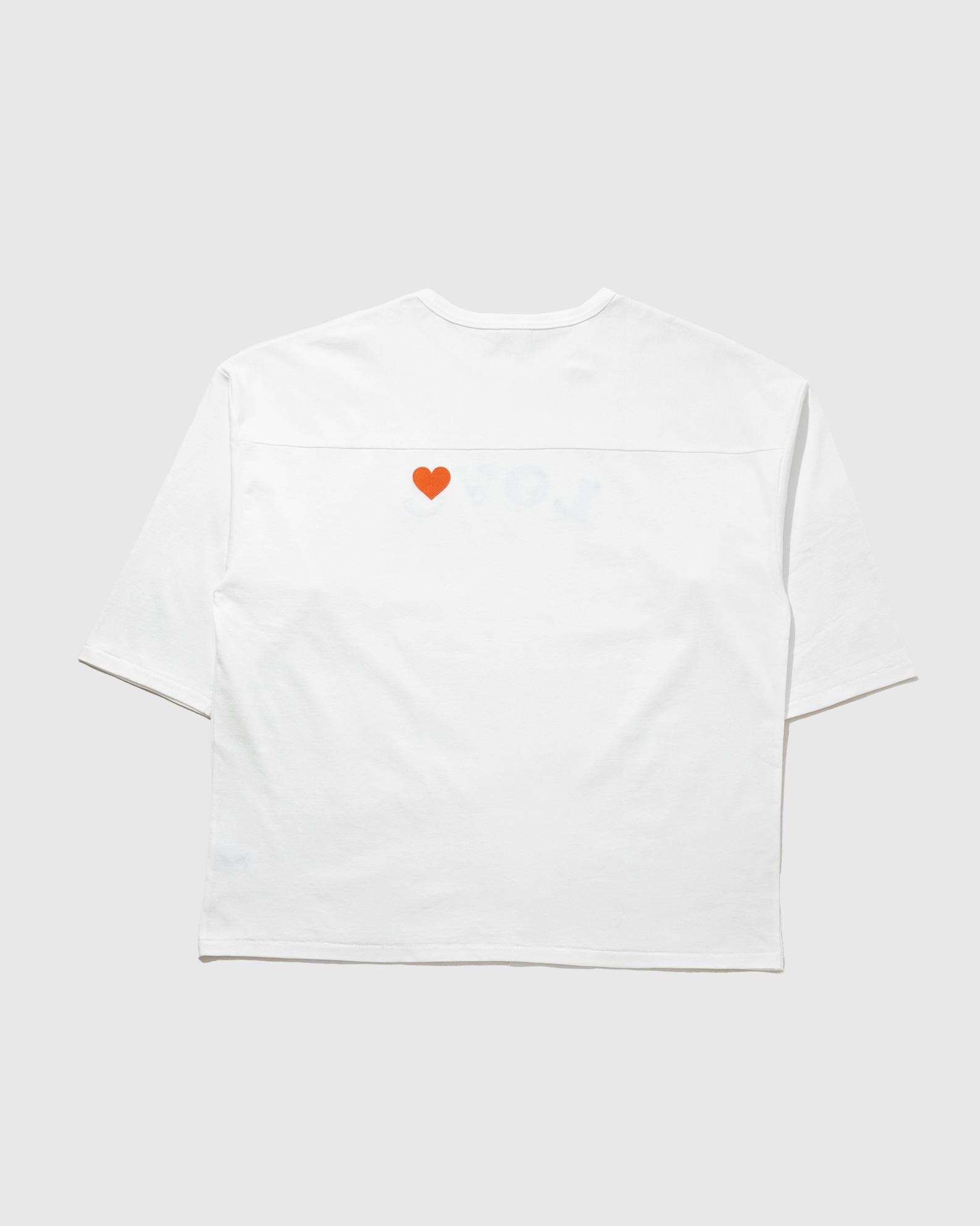 フェルトによる前面のロゴに加え、背面のハートがポイントになったフットボールTシャツ。