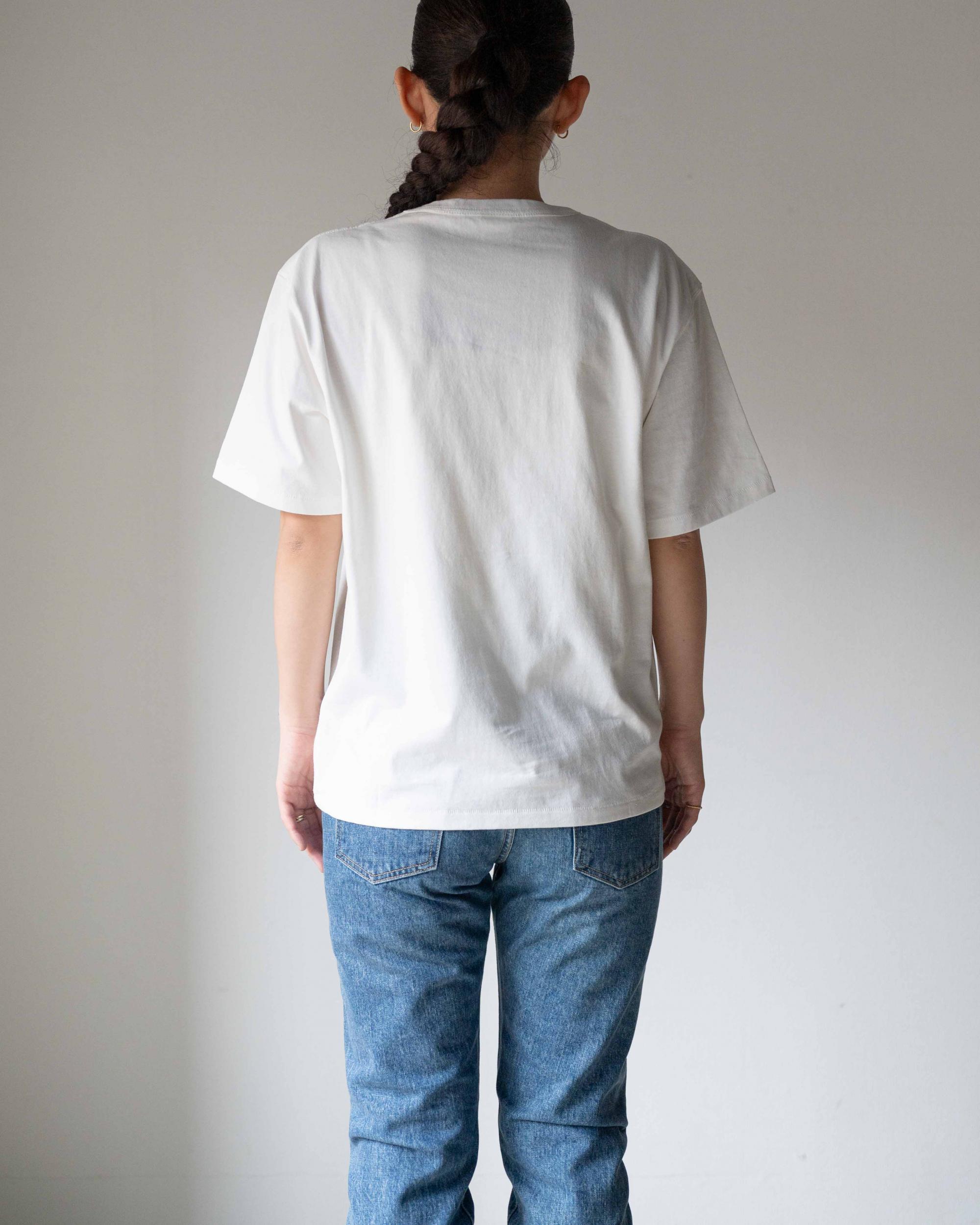 身幅と肩幅に若干のゆとりを与えたアメリカンライクなシルエットです。生地のハリ感により、シルエットを崩さずに1枚でも綺麗に着ることが出来ます。バインダーネックやシングルステッチなどのヴィンテージディテールを採用しています。