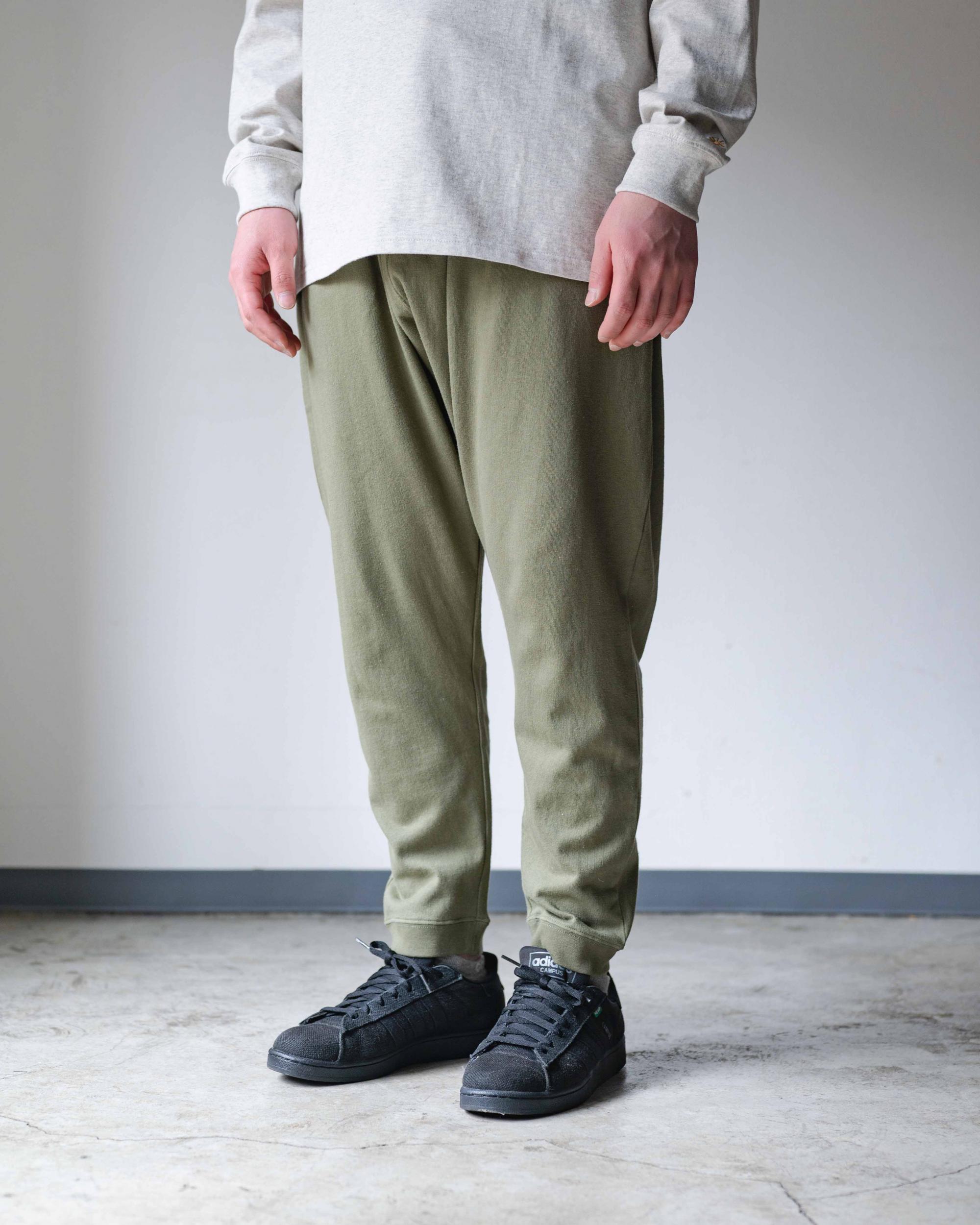 股上にゆとりをあたえたサルエルパンツです。ルーズな着用感ですが、膝から裾にかけて細身に仕上げ、やや短めの9分丈に設定することですっきりと上品な印象になるよう計算されています。