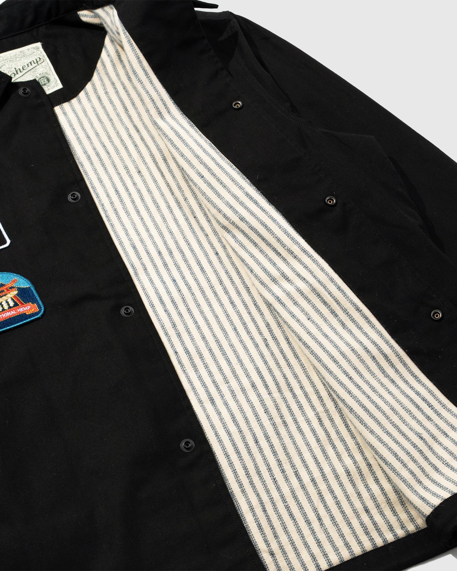 オリジナルワッペンをあしらったチンストラップ付きコーチタイプジャケット。
